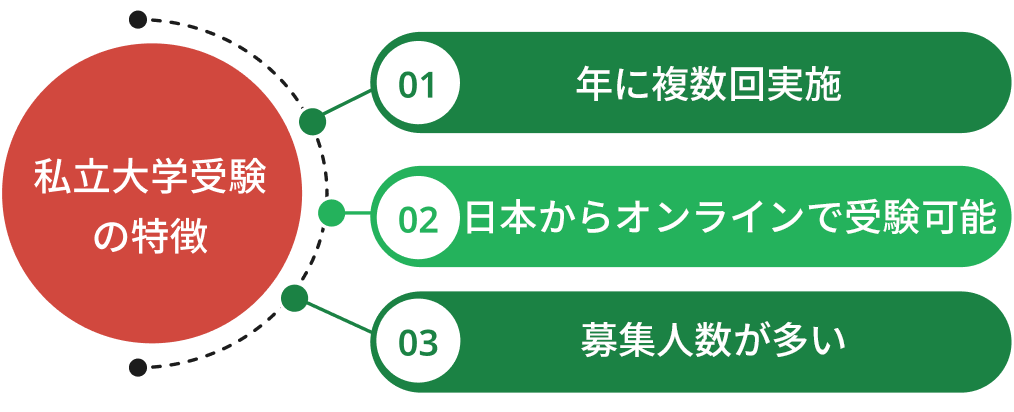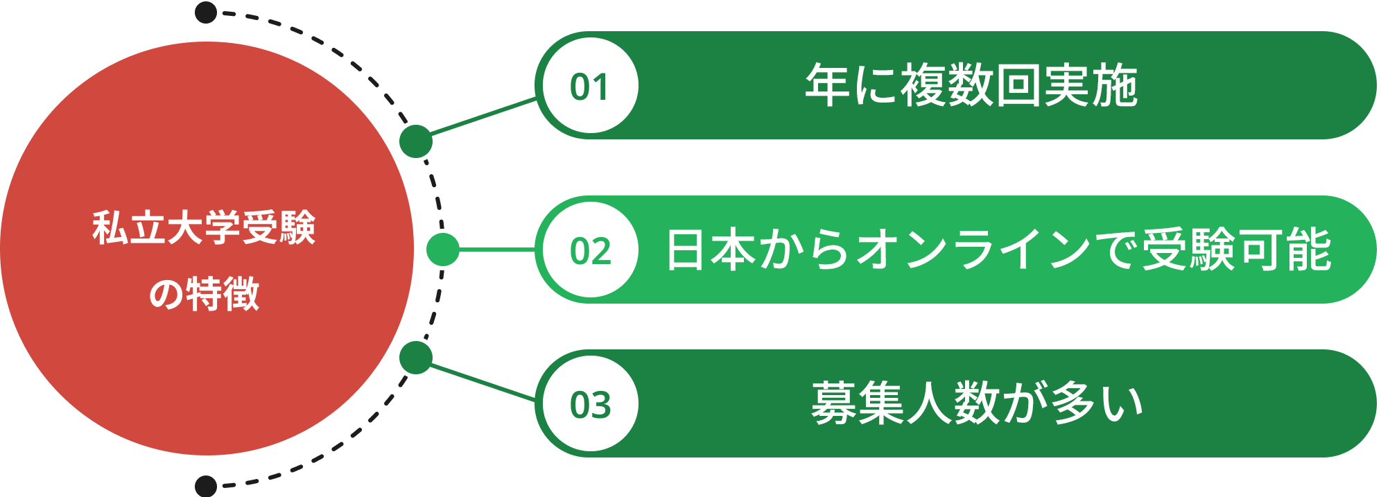 私立大学は国公立大学のような共通試験はなく、それぞれの大学が独自の試験を行います。