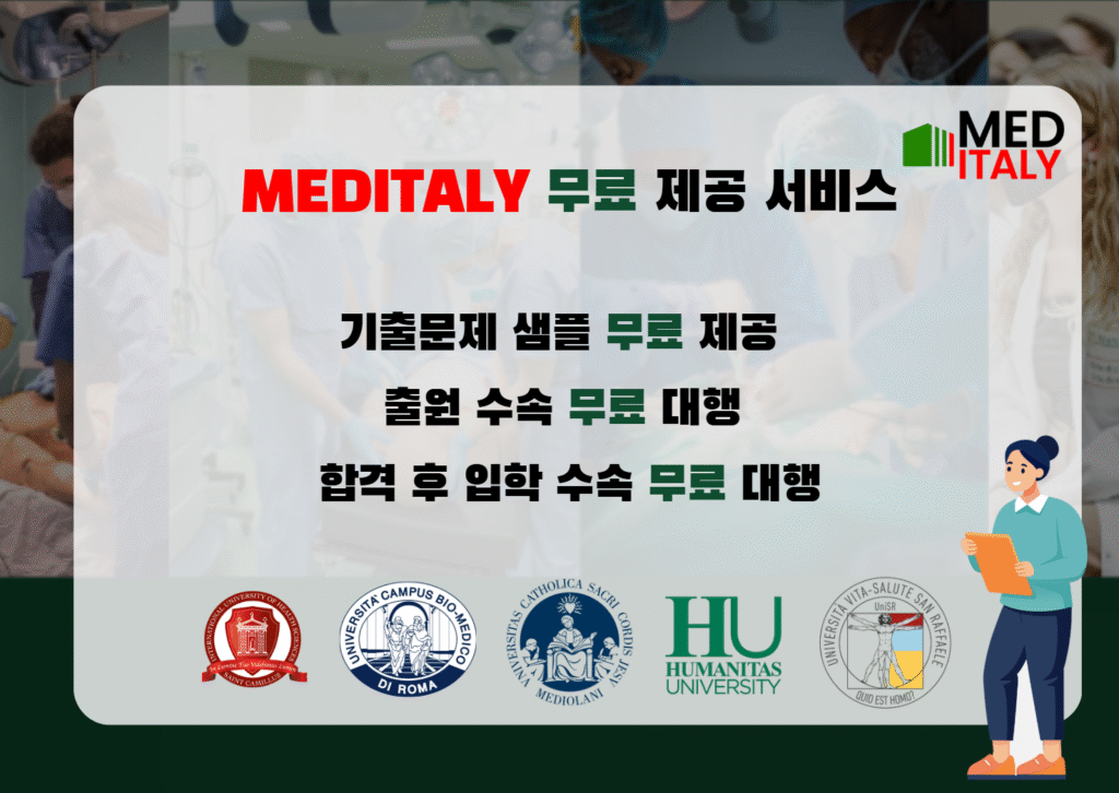 저희 MED ITALY는 비오메디코 대학의 한국 공인사무국인 단체로, 장기간에 걸쳐 축적한 비오메디코 입학 시험의 실제 기출문제를 보유하고 있습니다. 하여, 사립대학교 (비오메디코코 대학교 포함 총 다섯 사립대학교) 지원을 준비하는 수험생 분들을 대상으로 “기출문제 공유” 및 “출원수속 대행서비스”를 무료로 제공해드리고 있습니다. 이탈리아 사립대학교 의학부 지원을 고민하시고 계시거나 관심이 있으신 수험생 분들 이시라면, 꼭 저희 MEDITALY의 무료 서비스를 활용해 주시면 감사하겠습니다.